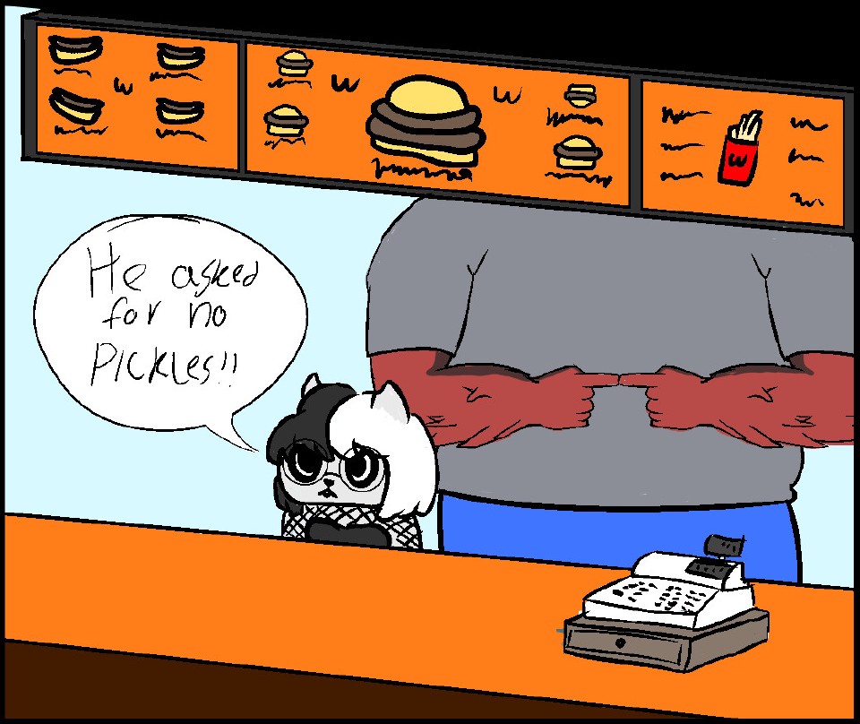 I posted about Pyro being too big and shy in a fast food place and Rúna drew this! It stars Catherine! She’s so cool.